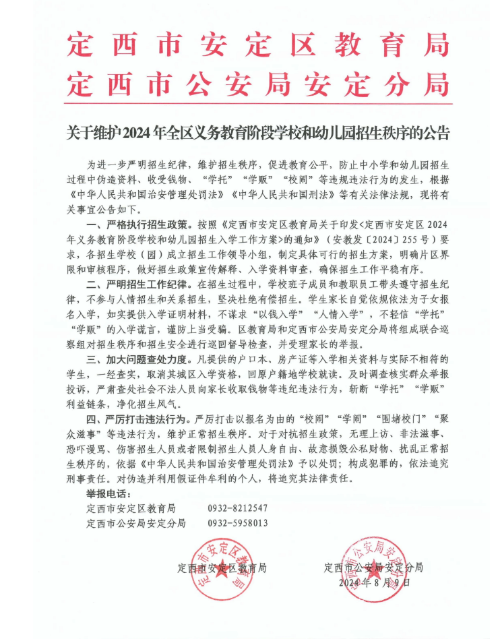 为进一步严明招生纪律,维护招生秩序,促进教育公平,防止中小学和幼儿园招生过程中伪造资料、收受钱物、“学托”“学贩”“校闹”等违规违法行为的发生,根据《中华人民共和国治安管理处罚法》《中华人民共和国刑法》等有关法律法规,现将有关事宜公告如下。 一、严格执行招生政策。按照《定西市安定区教育局关于印发<定西市安定区2024年义务教育阶段学校和幼儿园招生入学工作方案>的通知》(安教发〔2024〕255号)要求,各招生学校(园)成立招生工作领导小组,制定具体可行的招生方案,明确片区界限和审核程序,做好招生政策宣传解释、入学资料审查,确保招生工作平稳有序。 二、严明招生工作纪律。在招生过程中,学校班子成员和教职员工带头遵守招生纪律,不参与人情招生和关系招生,坚决杜绝有偿招生。学生家长自觉依规依法为子女报名入学,如实提供入学证明材料,不谋求“以钱入学”“人情入学”,不轻信“学托”“学贩”的入学谎言,谨防上当受骗。区教育局和定西市公安局安定分局将组成联合巡察组对招生秩序和招生安全进行巡回督导检查,并受理家长的举报。 三、加大问题查处力度。凡提供的户口本、房产证等入学相关资料与实际不相符的学生,一经查实,取消其城区入学资格,回原户籍地学校就读。及时调查核实群众举报投诉,严肃查处社会不法人员向家长收取钱物等违纪违法行为,斩断“学托”“学贩”利益链条,净化招生风气。 四、严厉打击违法行为。严厉打击以报名为由的“校闹”“学闹”“围堵校门”“聚众滋事”等违法行为,维护正常招生秩序。对于对抗招生政策,无理上访、非法滋事、恐吓谩骂、伤害招生人员或者限制招生人员人身自由、故意损毁公私财物、扰乱正常招生秩序的,依据《中华人民共和国治安管理处罚法》予以处罚;构成犯罪的,依法追究刑事责任。对伪造并利用假证件牟利的个人,将追究其法律责任。 举报电话: 定西市安定区教育局 0932-8212547 定西市公安局安定分局 0932-5958013