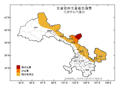 兰州中心气象台2025年11月25日17时40分发布沙尘暴蓝色预警:预计未来24小时内,河西五市及白银、平凉、庆阳三市有扬沙或浮尘,武威中北部有沙尘暴,北部有强沙尘暴;受沙尘扩散影响,兰州市及定西北部有浮尘或扬沙。请注意防范!