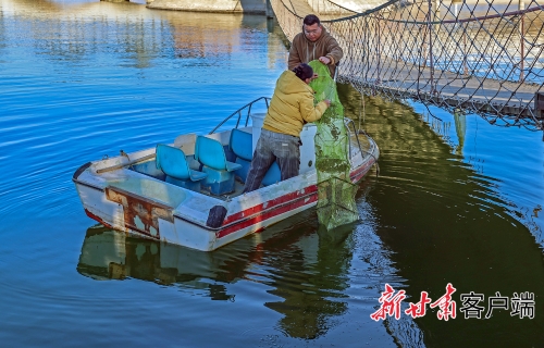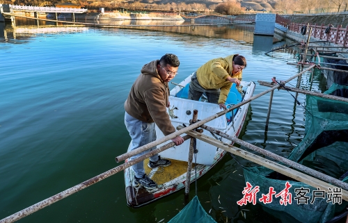 11月25日,在定西市安定区鲁家沟镇的凤城湖养殖基地,蟹农正在乘小船捕捞、分拣中华绒螯蟹。