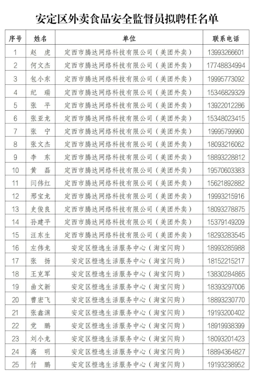 为构建外卖食品安全社会共治格局,拓宽社会监督渠道,广泛凝聚社会力量参与外卖食品安全监管,切实保障人民群众“舌尖上的安全”,经公开招募、平台推荐、资格审查、综合遴选,拟聘任一批外卖员同志为安定区外卖食品安全监督员。为确保工作公开、公平、公正,现将拟聘任人员名单予以公示,广泛接受社会监督。 一、公示时间 2026年3月20日—2026年3月26日(共5个工作日) 二、受理部门 定西市安定区市场监督管理局 三、反馈方式 公示期间,如对公示对象有异议,请通过电话、书面、电子邮件等形式,向定西市安定区市场监督管理局反映。反映情况须实事求是、客观真实,提供具体线索及相关证明材料,以便核查。 联系电话:0932-8212315 电子邮箱:adqgsj@126.com 通讯地址:定西市安定区公园路1号(安定区政府2号统办楼313室) 公示无异议后,我局将正式聘任并颁发聘书。外卖食品安全监督员任期内,依法履行监督巡查、线索反馈、政策宣传、意见征集等职责,共同维护全区网络餐饮食品安全环境。通过发挥外卖员“流动哨兵”作用,共同守护全区群众饮食安全。 附件:安定区外卖食品安全监督员拟聘任名单
