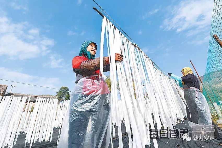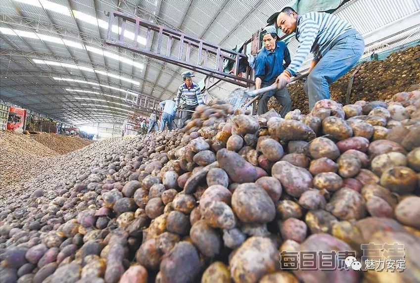当地农户在晾晒马铃薯宽粉。 2015年,农业部启动马铃薯主粮化战略,2016年甘肃省被列为全国首批马铃薯主食开发试点省份,这给安定区马铃薯加工企业带来机遇。目前,这些企业已研制4大类30多种马铃薯主食化产品。有的企业尝试制作烤馍、馒头、麻花等加入马铃薯全粉的面点,深受顾客喜爱。2015年,安定区与阿里巴巴集团签订了“农村淘宝”项目合作协议,当地马铃薯插上“互联网+”的翅膀,跨越千山万水,“飞”进千家万户。