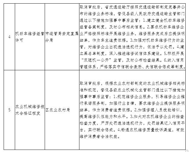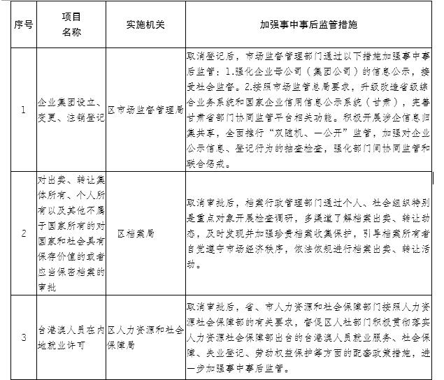 (五)取消其他行政权力事项目录(1项) 序号 | 项目名称 | 实施机关 | 加强事中事后监管措施 | 1 | 设立分公司备案 | 区市场监督管理局 | 取消备案后,市场监督管理部门通过以下措施加强事中事后监管:1.建设维护信息系统,完善规章制度,明确分公司设立信息要及时推送、及时更新、及时公示,加强监管。2.按照市场监管总局要求,升级改造省级综合业务系统和国家企业信用信息公示系统(甘肃),完善甘肃省部门协同监管平台相关功能。积极开展涉企信息归集共享,全面推行“双随机、一公开”监管,加强对企业公示信息、登记行为的抽查检查,强化部门间协同监管和联合惩戒。 |