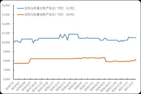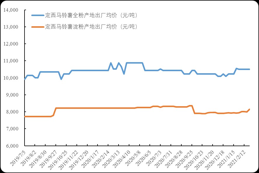 数据来源:新华指数 图2.定西种薯品种别产地批发价格演变图 下游:就地过年助推食品企业复工,定西薯制品需求强劲,出厂价格上调 就地过年加快春节后复工复产,全国薯制品需求强劲、供给吃紧、薯制品出厂价格提升。自元旦以来,定西马铃薯淀粉产地批发价格首次出现小幅上涨。截至2月26日,定西马铃薯淀粉产地批发价报8152.17元/吨,环比上涨156.52元/吨;定西马铃薯全粉产地批发均价报10500.00元/吨,与上期持平。当前,甘肃定西、宁夏西吉等马铃薯加工企业提早采购加工商品薯恢复生产。元宵节后,伴随下游食品企业全面复工,需求继续上涨,国内薯制品出厂价格看涨。