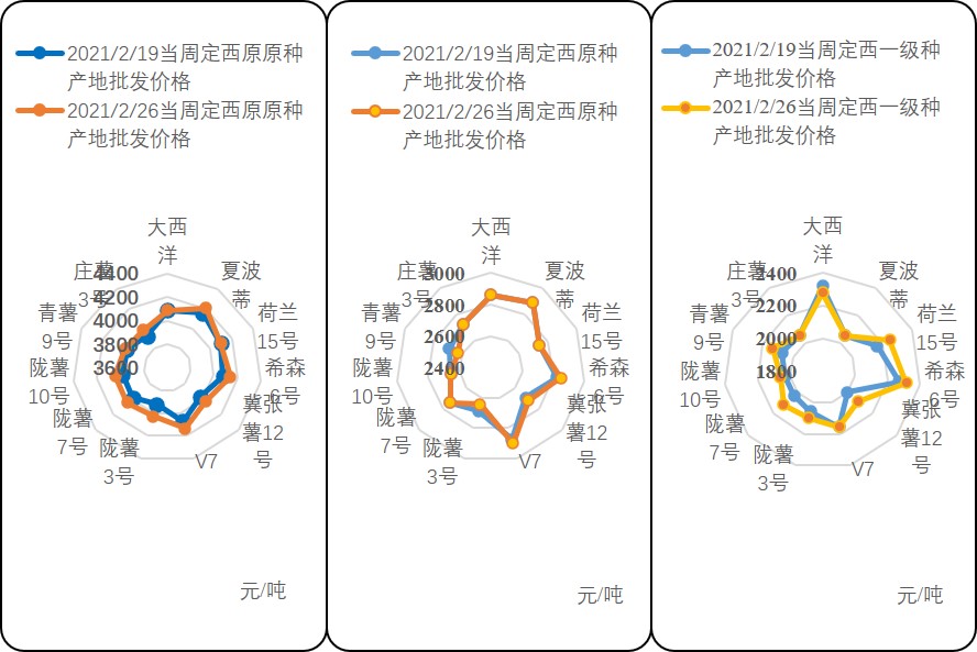 数据来源:新华指数 图1.国内马铃薯四大产区种植规律分布图 上游:北方一作区马铃薯开启大规模种植,定西种薯产地价格上涨 据悉,节后西南混作区及北方一作区开始大规模种植马铃薯。西南混作区:高海拔地区业已进入种植高峰期,产区仅存在政府招标或零星补货,种薯价格相对平稳。北方一作区:温热条件较好的甘肃南部、山东胶东等地区开始大规模种植,定西种薯销售正逐步切换到北方一作区。 鉴于北方一作区规划提升种植面积,国内种薯市场需求强劲,近期定西种薯产地批发价格整体呈现上涨走势。其中定西及周边地区的使用原种种植,合作社自身部分留存中晚熟品种种薯,导致定西原种产地批发价格出现微幅下调。截至2月26日,当周定西原原种产地批发均价报4057.84元/吨,较上一周上涨0.81%;定西原种产地批发均价报2719.45元/吨,较上一周下跌0.60%,其中仅有青薯9号和陇薯3号出现小幅下跌;定西一级种产地批发均价报2146.48元/吨,较上一周上涨1.70%。后期北方一作区更多区域开展马铃薯春耕种植,定西种薯市场价格继续看涨。此外,近期中亚五国商品薯供应不足,市场价格持续攀升,对优质高产种薯需求强劲。