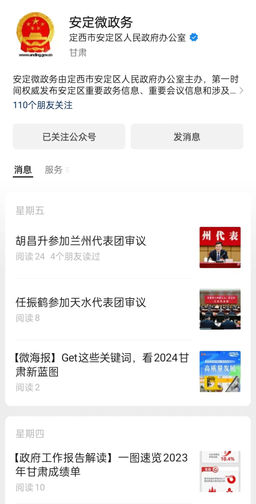 (四)政府信息公开平台建设 持续优化网站栏目,将公开信息更加准确地分类,方便了群众查找信息,持续运营“安定微政务”政务新媒体公众号,账号运营状态良好,严格审核发布信息,落实”三审三校“制度,积极转发盛世要求转发内容2023年在公众号发布信息1325条,回应与群众切身利益密切相关的热点问题,做好舆论引导工作,切实维护好政府公信力。