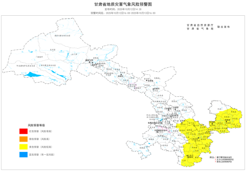 甘肃省自然资源厅、甘肃省气象局于2025年10月12日14时30分联合发布地质灾害气象风险预警:10月12日16时至10月13日16时,庆阳市(西峰区、庆城县、环县、华池县、合水县、正宁县、宁县、镇原县),陇南市(武都区、成县、文县、宕昌县、康县、西和县、礼县、徽县、两当县),定西市(安定区、通渭县、陇西县、渭源县、临洮县),天水市(秦州区、麦积区、清水县、秦安县、甘谷县、武山县、张家川回族自治县),白银市(会宁县),平凉市(崆峒区、泾川县、灵台县、崇信县、庄浪县、静宁县、华亭市)发生崩塌、滑坡等地质灾害的风险较高(黄色预警),请注意防范。