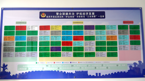 科学分级推动企业规范管理。安定区以经济开发区为试点,率先推行“三色预警”管理机制,围绕安全管理、隐患治理、案事件情况以及消防设施等关键指标,每季度进行一次评估,将辖区企业精准划分为“绿、黄、红”三个预警等级,分别对应治安管理优秀、良好和不达标三类,对不同预警等级企业实行差异化管理。通过“图表上墙、动态管理”的方式,实现企业对风险隐患一目了然、管理责任清晰明确,同时也为民警实时掌握辖区治安管理漏洞提供了便利。