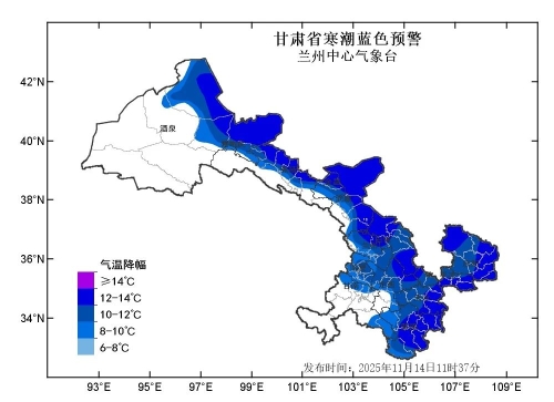 兰州中心气象台2025年11月14日11时37分发布寒潮蓝色预警:预计未来72小时,除酒泉市西南部、甘南高原外,全省大部气温累积降幅将超过8-10℃,其中,河西偏北地区及陇中偏北地区和陇东、陇南地区的大部分地方有寒潮,气温累积降幅可达12-14℃。请注意防范!
